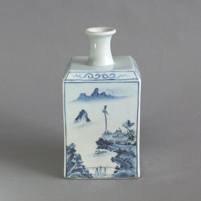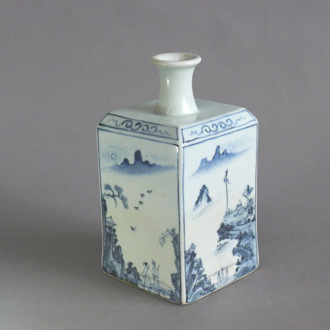 사진1의 「백자 청화 산수누각무늬 사각병」은 제작 과정이 매우 까다로운 판형기법으로 만든 사각 병으로 18세기 후반경에 왕실 관요에서 제작된 유물이다. 이 사각병은 고급의 정선된 하얀 태토를 사용한 사각기둥 모양의 몸통에다 가운데가 좁아지는 유선형의 긴 목에 벌어진 입구를 별도로 성형하여 붙였다. 몸통이 안정적인 형태의 수준 높은 유물로 어깨의 모서리를 비스듬히 깎아내고 고운 발색의 청화안료를 사용하여 무늬를 그려 넣었다. 모깎기를 한 어깨 부분의 경사면에는 간략화된 넝쿨무늬를 그렸고 몸통의 4면에는 각각 테두리 선으로 면을 구성하고 그 속에 원경, 중경, 근경의 산수 인물무늬를 세련된 필치로 능숙하게 그려 넣었다. 마치 4폭의 산수화 병풍이 펼쳐진 모습이며 몸통에 그려진 산수무늬 중에 사진4는 ‘소상팔경도 瀟湘八景圖’ 중에 산시청람 山市晴嵐으로 가까운 근경에 높게 솟은 바위 사이에 이야기하는 두 사람을 배치한 것이다. 산수화의 격이 매우 높아 왕실의 화원화가 작품으로 생각된다. 사진2,3)