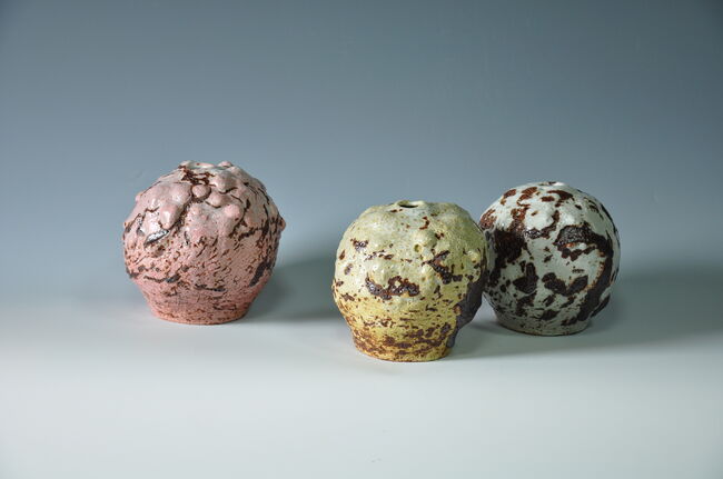 조선백자의 정수로 불리는 달항아리는 고유의 비례미와 상징성을 통해 한국 도자의 미감을 대표한다. 그러나 김윤선은 이 전통적 형태를 단순히 재현하는 데 머물지 않는다. 오히려 그는 달항아리의 본질을 현대적 감수성과 조형의 실험을 통해 새롭게 정의 하고자 한다. 그의 작업은 전통의 계승이라 기보다, 그것에 대한 비평적 응답에 가깝다. 그의 달항아리는 백자의 광택이나 대칭성을 의도적으로 거부한다. 대신, 거칠고 무심한 표면과 불균형한 형태, 다양한 자연물의 재료가 주는 예측 불가능한 질감이 그의 달 항아리를 채운다. 그는 점토의 밀도를 자연 소재로 조정하고, 유약과 안료의 조합도 철저히 즉흥적이다. 장작가마와 라쿠가마라는 전통적 번조 방식의 활용은, 작가의 조형 언어에서 중요한 우연성을 확보하는 수단이 된다.