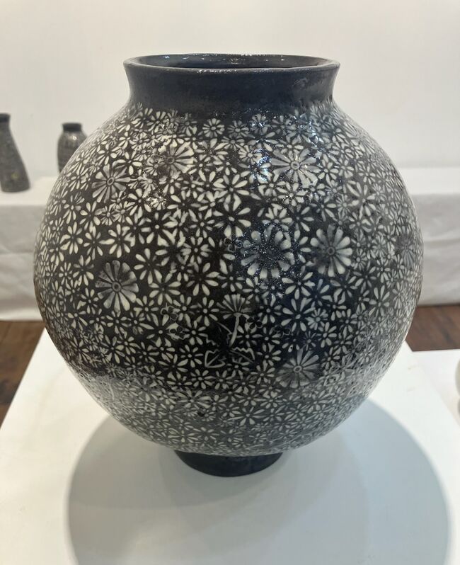 유병임의 개인전 《달빛을 찍다》는 분청도자의 자유로움과 여백의 미를 바탕으로 일상에서 마주한 우리꽃의 아름다움을 담아낸 작업들로 구성되었다. 작가는 투박하면서도 따뜻한 분청의 질감과 미백의 흐름에 매료되어 늦게 도자의 길에 들어섰으며, 인내가 요구되는 과정 속에서도 창작의 즐거움을 이어왔다. 이번 전시에서는 분청 기법 중 인화문 기법을 활용해 주변의 우리꽃을 찍어내듯 표현함으로써 단아하고 소박한 정서를 도자 위에 드러냈다. 회화와는 다른 방식으로 꽃의 형태가 조용히 스며든 작품들은 도자기 자체가 하나의 감성적 화면임을 보여주었다. 《달빛을 찍다》는 여백과 절제의 미학을 품은 분청도자의 매력을 다시금 환기시키며, 작가가 우리꽃을 더욱 우아하고 자유롭게 탐구해 온 여정을 담아낸 전시였다.